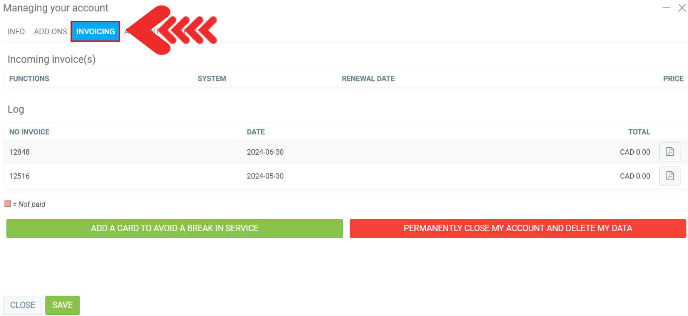 The Invoicing tab shows the history of invoices issued, the option to Add a card to avoid service interruption and the option to Permanently close my account and delete my data.