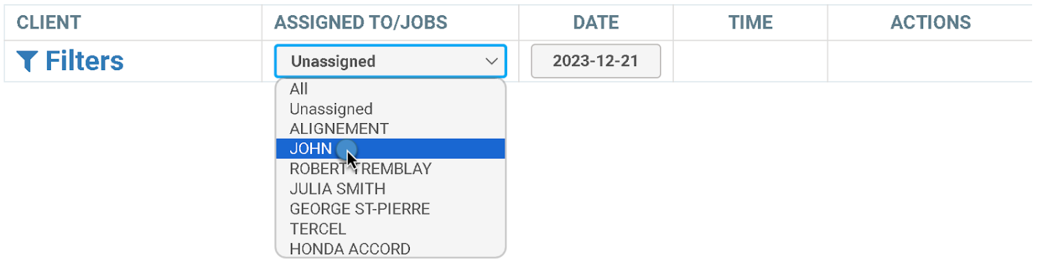 If you still can’t see a job make sure you are looking at the right mechanic schedule. For instance, if our mechanic named john cannot find his jobs and the Assigned to/jobs box is unassigned.
