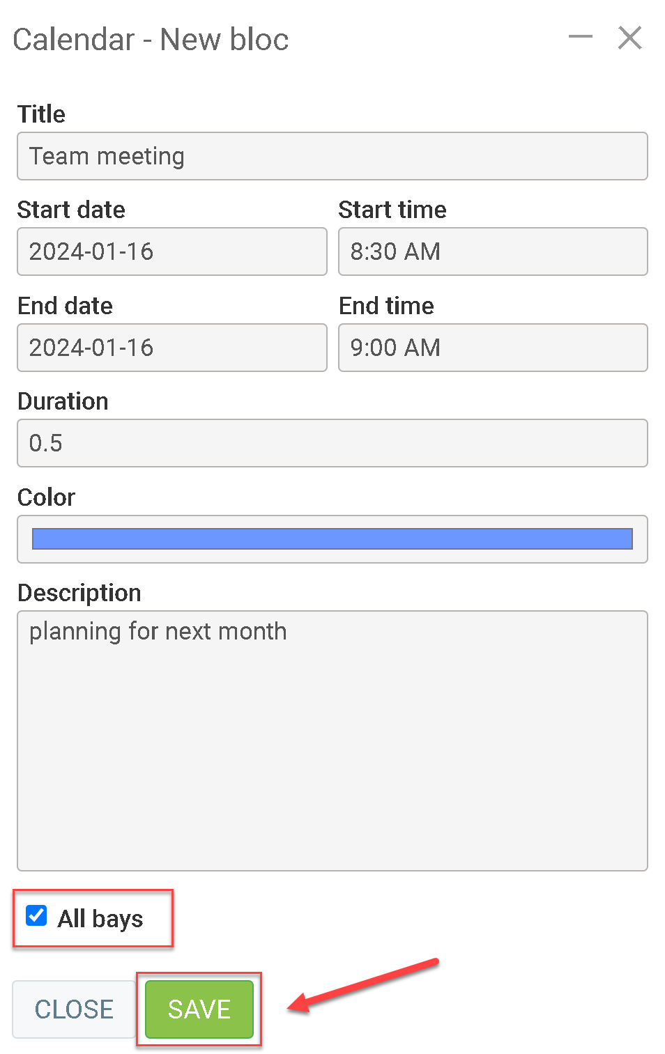 Choose a title, the start time, the duration and a small description. You can choose the color and the option ''All bays''.