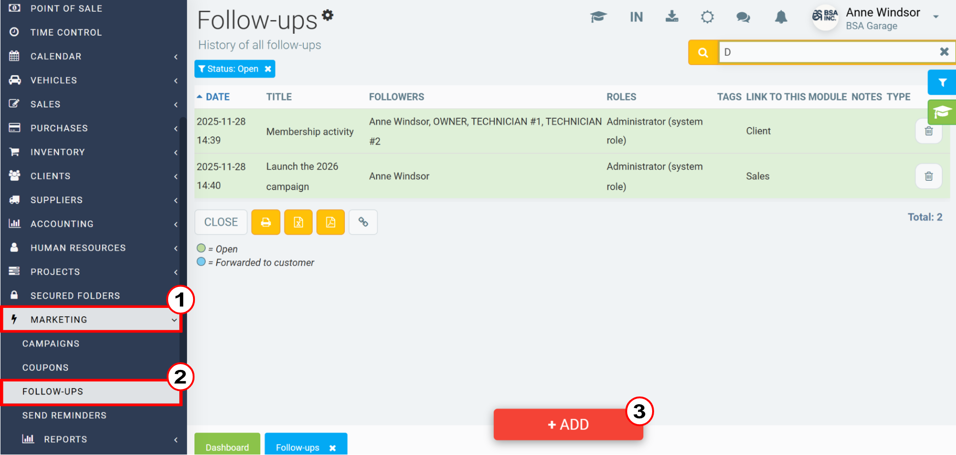 You can also access the following tabs in the left-hand menu: Marketing > Follow-ups.