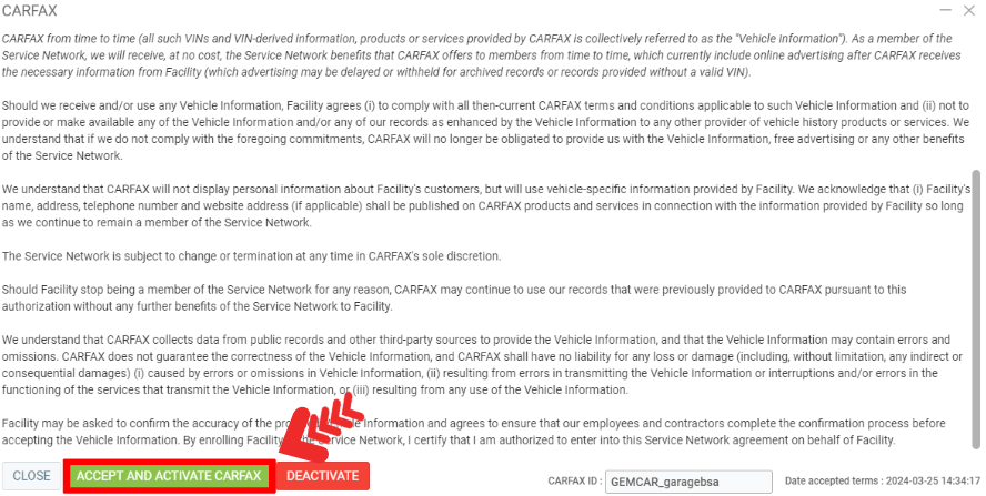 When you create a GEM-CAR account, you can accept CARFAX's terms and conditions as soon as the window appears. However, you can also activate them in another way.