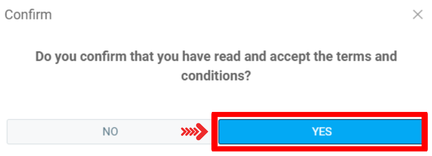A confirmation window opens with the following message: ''Do you confirm that you have read and accept the terms and conditions?