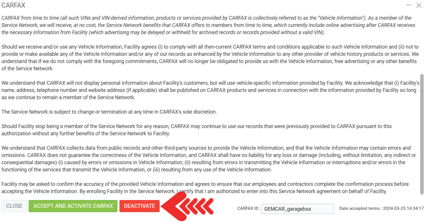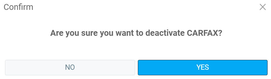 A confirmation window will open with the message: ''Are you sure you want to deactivate CARFAX?''