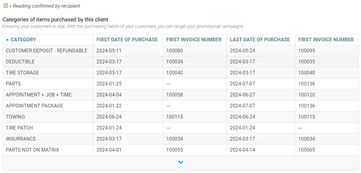 In this tab, you can see the Follow-ups associated with this client, E-mails exchanged with this client and the Categories of items purchased by this client.