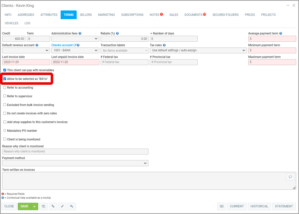 In the Terms tab of the client record, it is important to select "Allow to be selected as 'Bill to'".