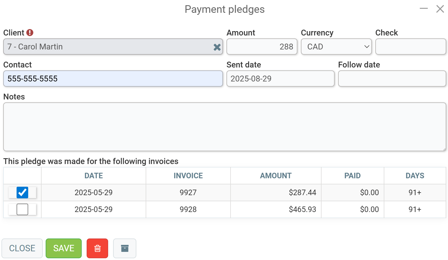 The page will display the details of the client’s unpaid invoices and, at the bottom of the page, you will find the Payment Pledge menu.