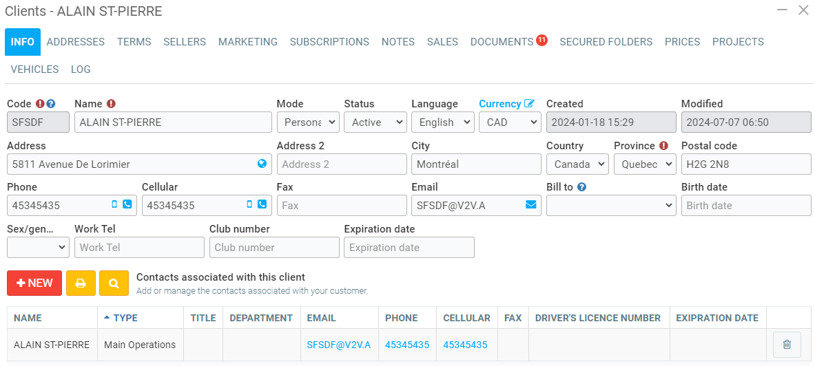 Start with the first tab, Infos. This section contains the client's general information.