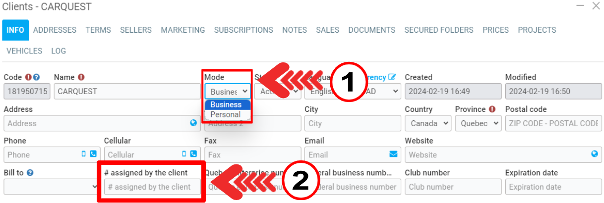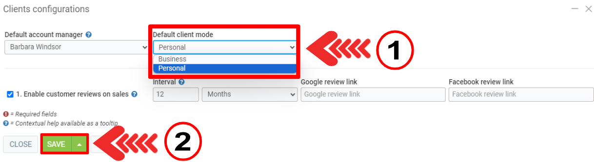 Note: If your clients are more often one or the other (business or individual), there is an option in Clients > Configurations > Configurations that allows you to select the Default client mode.