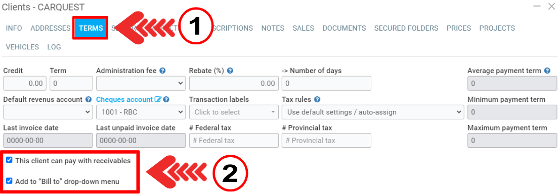 - To ensure that clients can pay via receivables when applicable, remember to check the "This client can pay by receivable" option if applicable under the Terms tab in their client record. If this option is not checked, the receivables payment option will not be available to them when making payments.