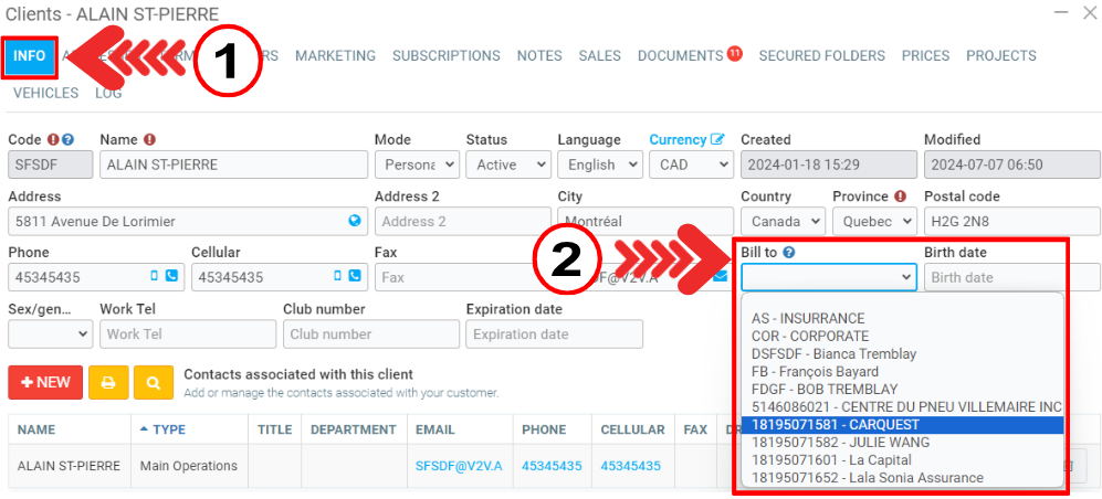 Consider a scenario where a client, Alain St-Pierre, visits a workshop for vehicle repairs. The workshop wants to bill the services provided to Alain St-Pierre to another entity, CARQUEST.