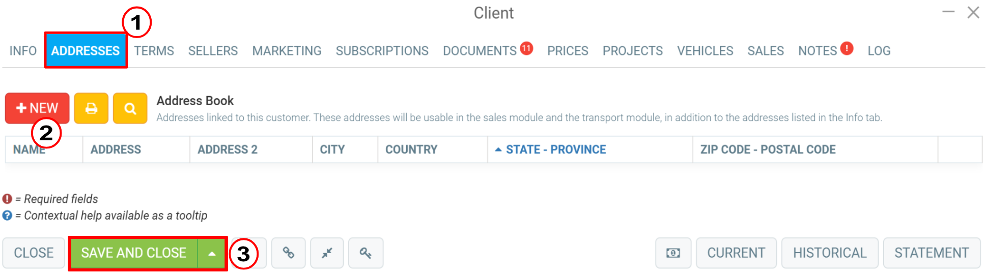 Next, click on the Addresses tab and press the red +New button next to Address Book.