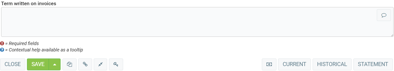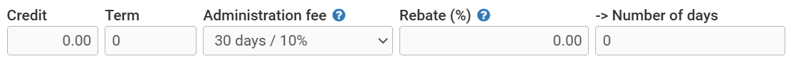 The first line of fields indicates whether the customer has a Credit to use your services or consume your products. The “Credit Code” is specific to your business. You can also fill in the “Term” field to define how long the customer can use this credit. If you have granted a special discount to this customer, insert it in the “Discount (%)” field, with the condition of payment by a date you will determine.