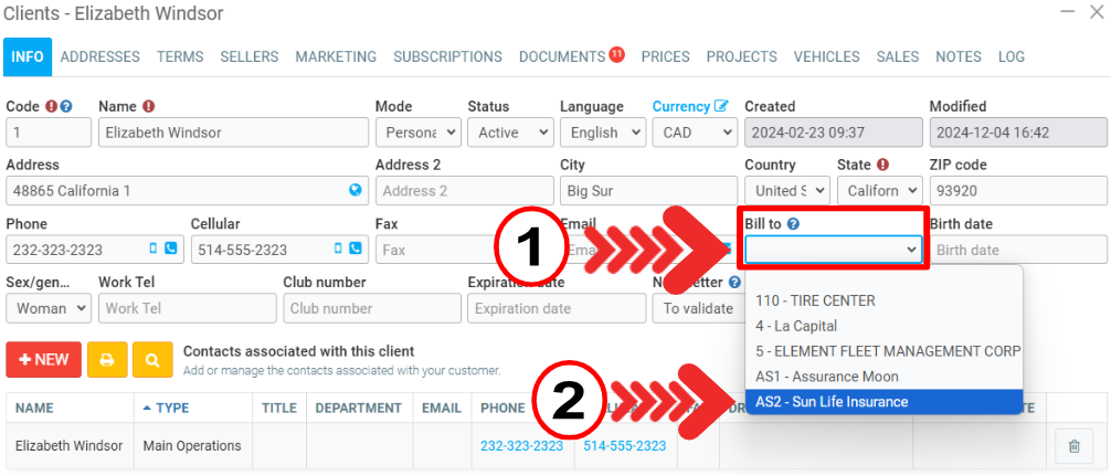 On the Info tab, click on Bill to and choose the client who will be responsible for paying for the services and products purchased by the other client.