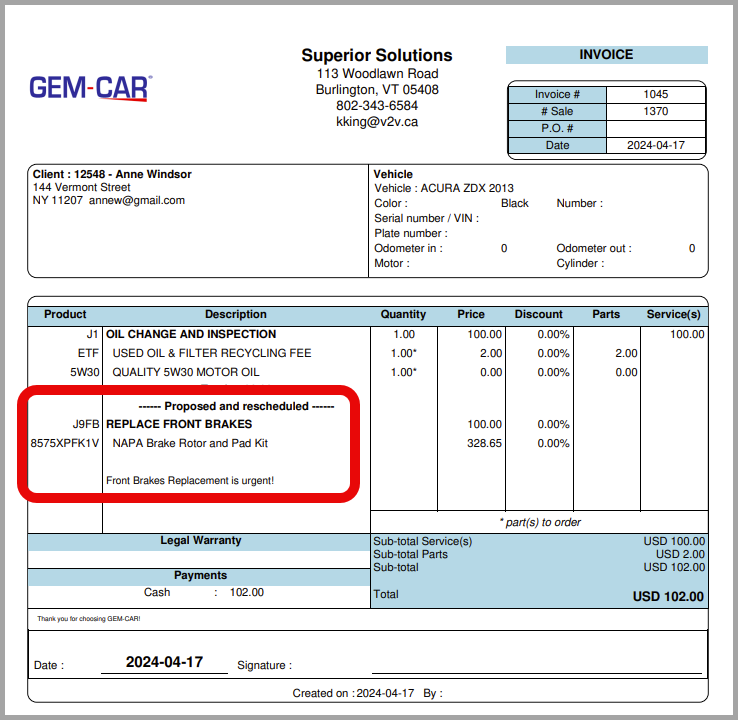 The items Proposed and rescheduled appear automatically on the invoice.