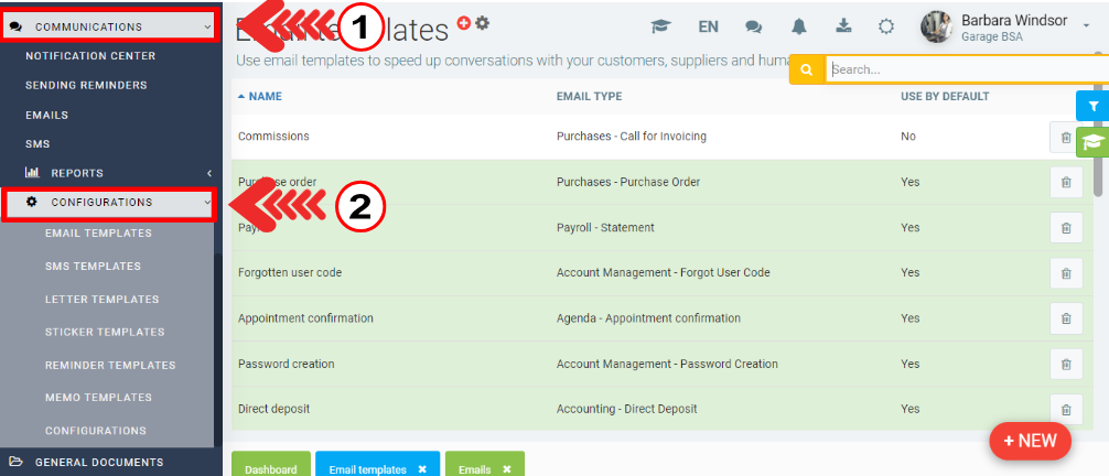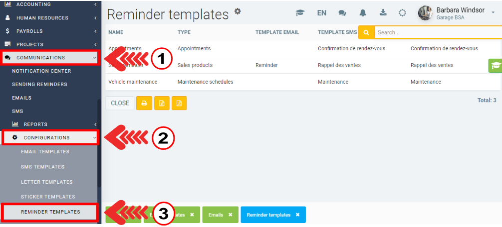 From the left main menu, click on Communications > Configurations > Reminder templates.