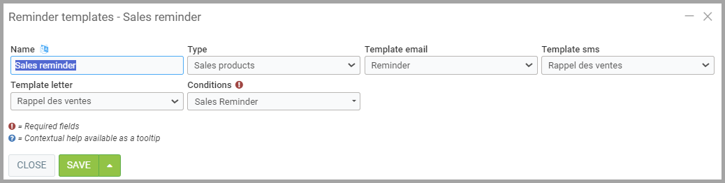 Choose a name for the reminder type and select the Template (created in step 1) you want to use for your reminder.