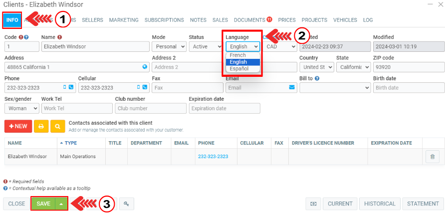 To change the communication language for a customer, from the main menu on the left of the screen, click on Clients > Clients > Info tab.