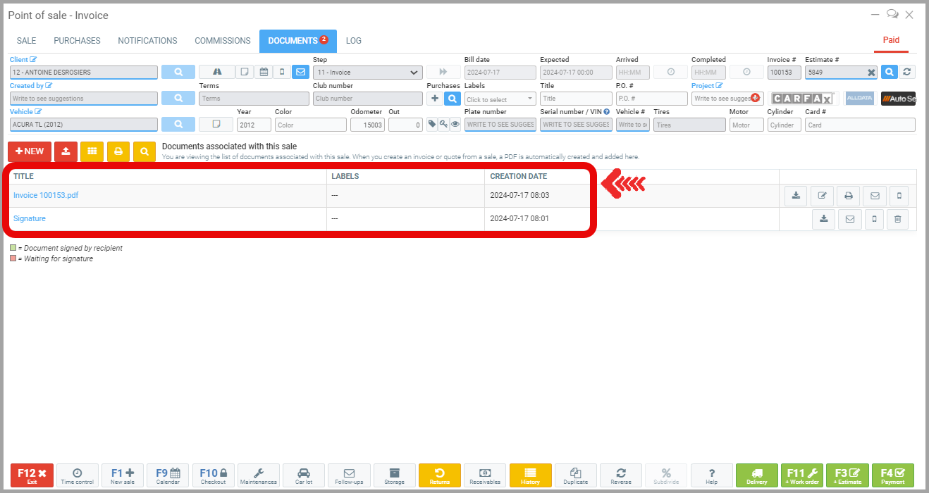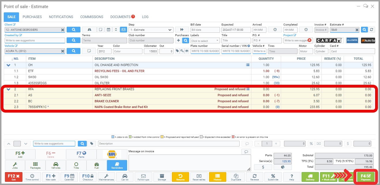 Once the estimate is complete, simply make the Payment (F4) by clicking the button at the bottom right. Once the payment is completed, the invoice is produced under the Documents tab. The proposed and refused works appear.