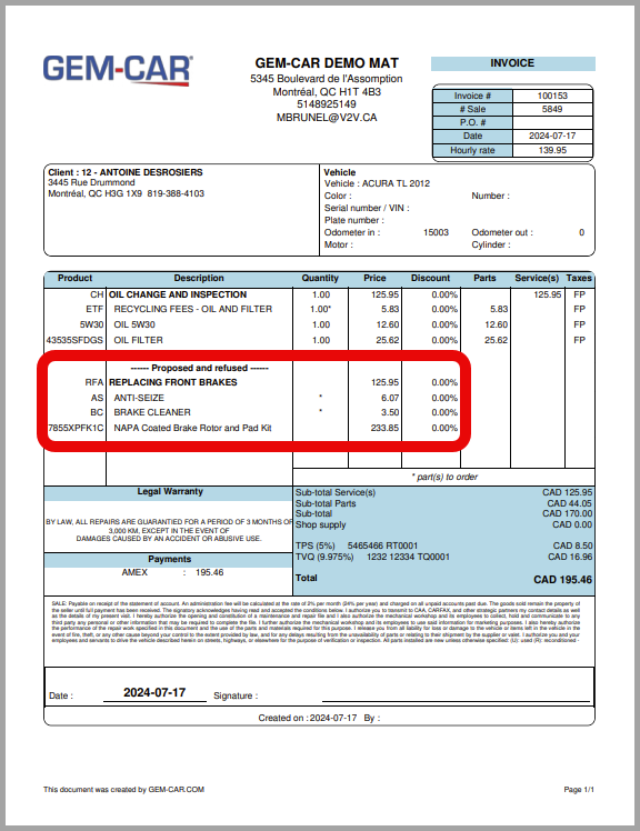 The note Proposed and Refused now appears on the work to be done and on the associated parts. Also note that the price associated with this work is $0.