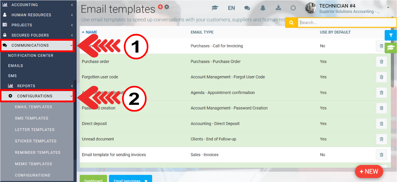 To create or view letter, e-mail and/or reminder templates, go to the left menu Communications > Configurations.