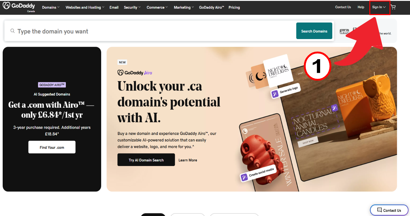First, log in to your GoDaddy account. Click on Sign in in the top right corner of the screen.