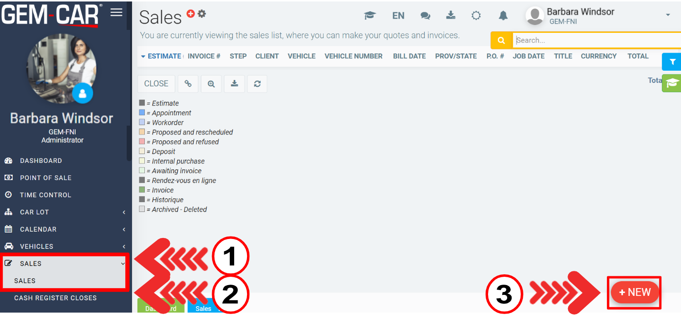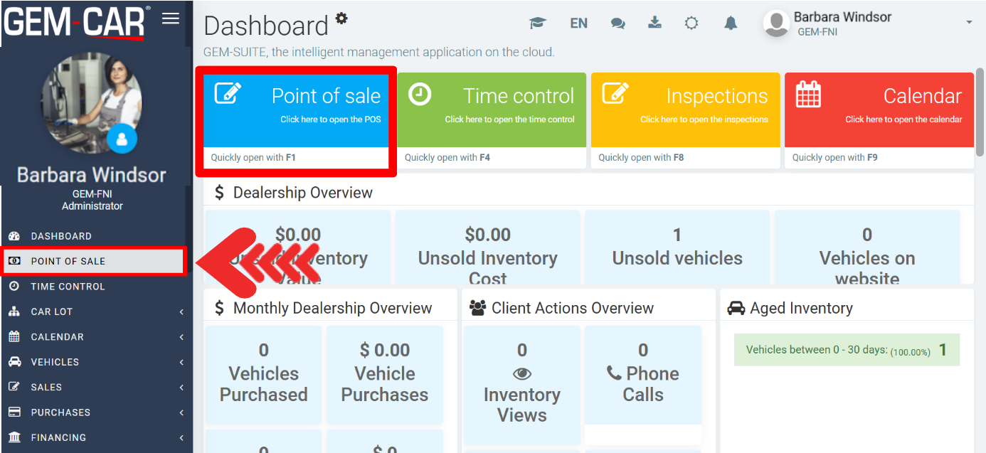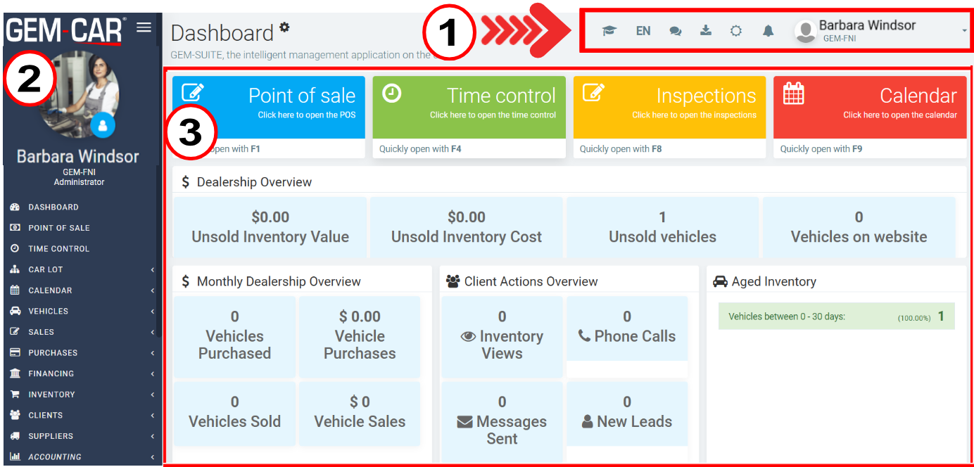 At the top of the dashboard, clients with the GEM-FNI module see the most important statistics for their dealership.