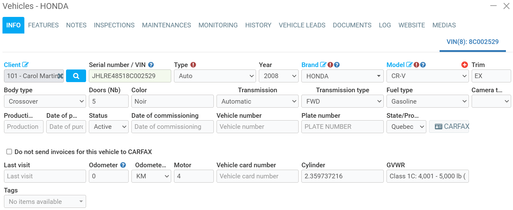 Then, once you've located your vehicle in the list, simply click anywhere on the row and a window will open, allowing you to change the information related to the vehicle.