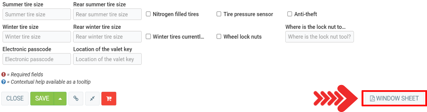 Once you've opened the vehicle file, in the Info tab, click on the Window Sheet button in the lower right corner of the page.