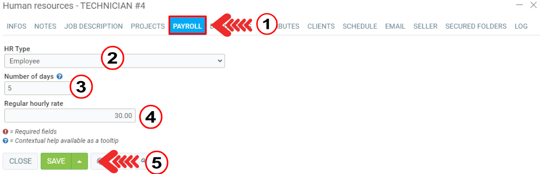 You must first choose the type of human resource at the top if it is not already done. If you choose 'Freelancer', the employee will not receive any payroll by the system, it will be used in the purchasing module in the 'Call for billing' portion. For the employee to receive a payroll, you must set the type to 'Employee'. Several fields will then be displayed, you must fill all of them. Enter his hourly rate, the type of employee, or other income/deductions he may have. Note that an employee may have more than one employee category so that the financial statements reflect this information. For personal exemptions, it is normally best to click the 'Default exemption' options. This way, the employee will have the default government exemptions. You can however add a supplement in the 'Additional Deductions' boxes if necessary.