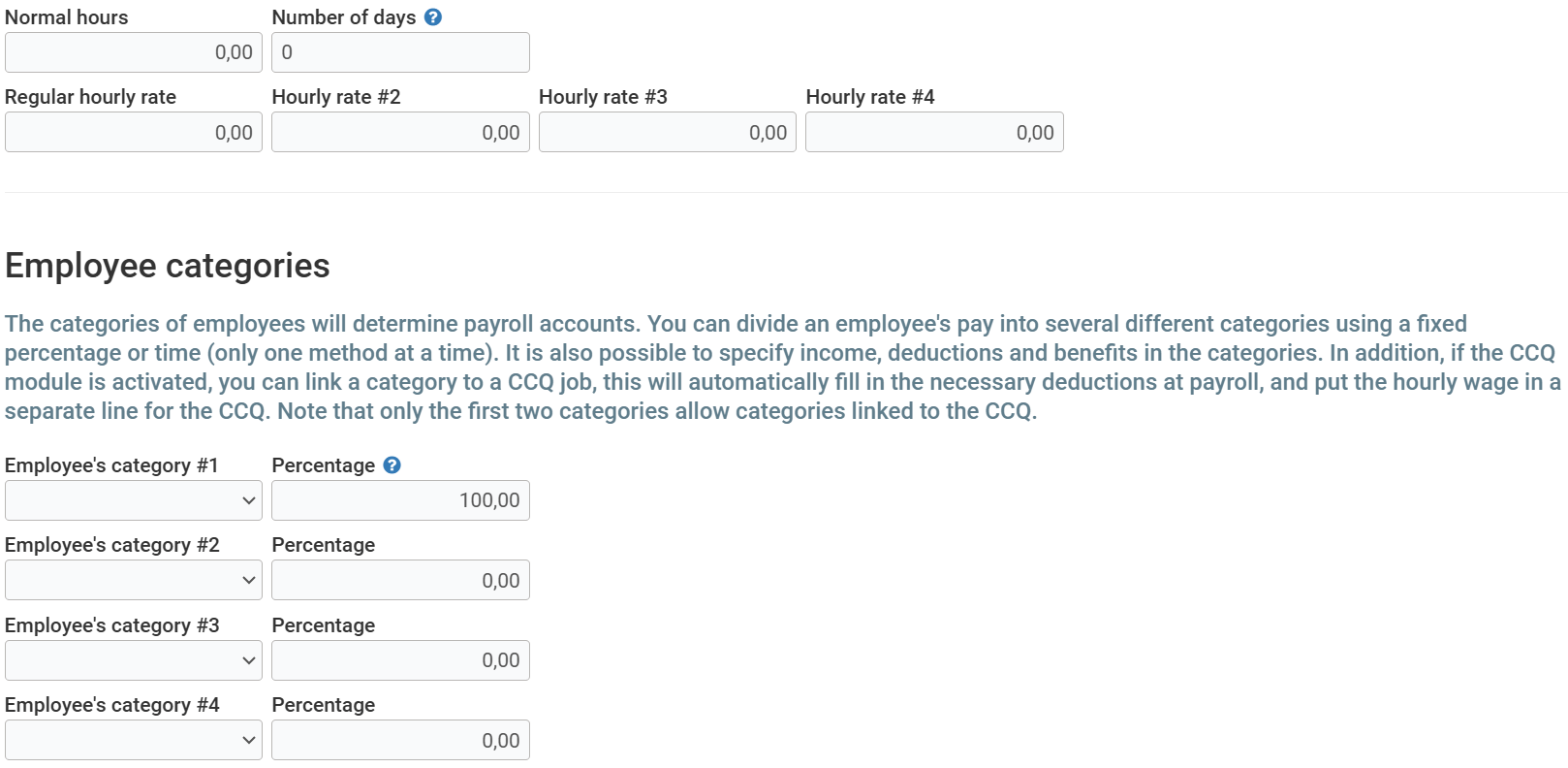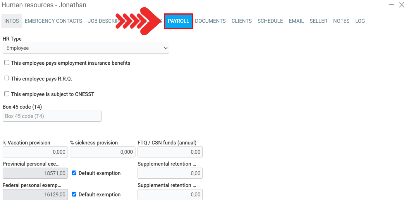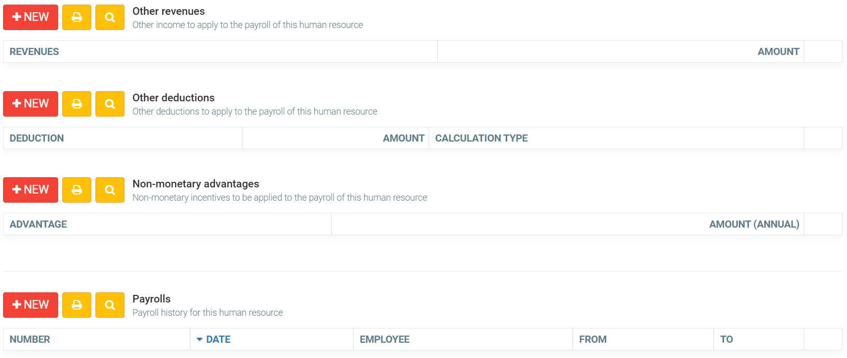In addition, under the tab Payroll of this section, you can configure Payrolls, Other revenues, Other deductions, Non-monetary advantages for this category of employee. This will make sure that all human resources having this category of employee will have these configurations automatically.