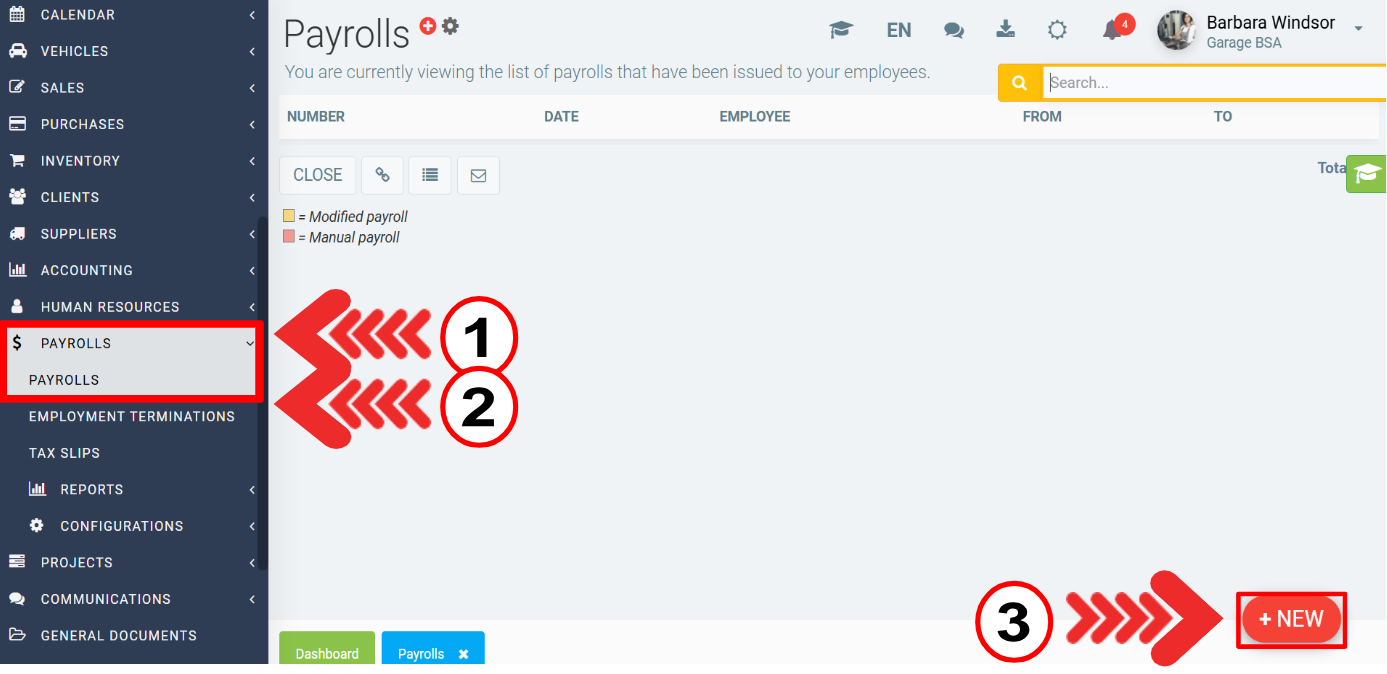 You are now ready to make payroll in GEM-CAR! Open the Payrolls menu and click on the +New at the bottom of the list. If the window opens, it means that your configurations have been completed, if an error message appears, it means that a configuration has not been correctly completed, the error will specify where the problem is. When naming your payroll, we recommend something like 1801 for the first payroll of 2018, 1904 for the 4th payroll of 2019, etc.