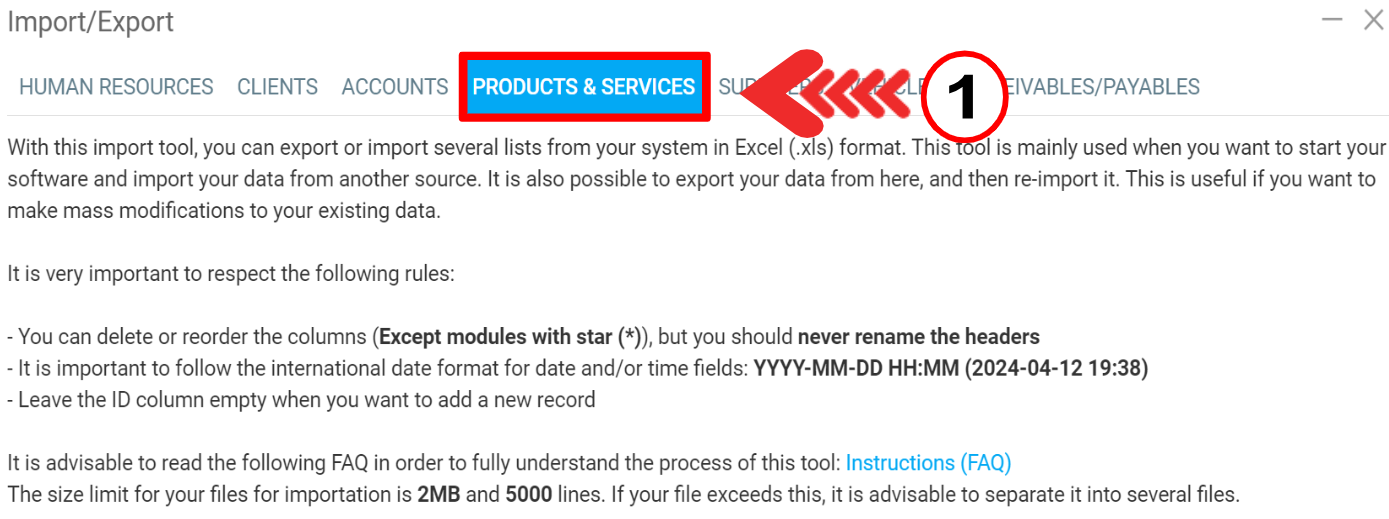 If click on Products & Services, you can click on "Download template file". The Excel document will display the following columns: