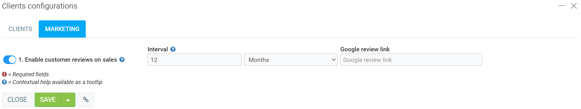 If you want to know the meaning of the box Enable customer reviews on sales, hover over the words and a blue balloon will appear explaining the following: "Following a sale, customers will receive an automatic email asking to review the following links. Make sure you have set up a 'Marketing - Customer Reviews' type email template for this system to work well".