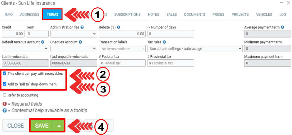 Then click on the Terms tab and select the options ''This client can pay with receivables'' and ''Add to 'Bill to' drop-down menu''.