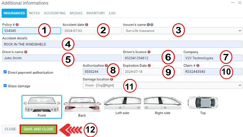 When you follow the steps at the Point of sale, after selecting the insurance form and clicking on the red dialog box, the window that appears asks you for the accident data.