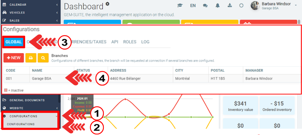 Click on Configurations > Configurations > Global tab, select at the bottom of the page, the branch to configure by clicking on its name.
