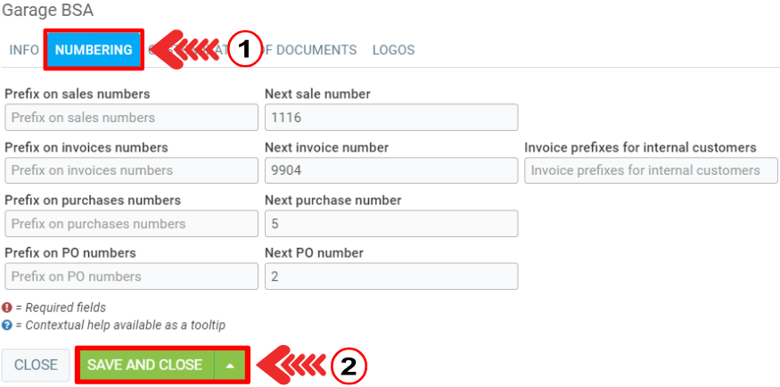 Note: If you need to reset the document numbering sequence for a company or a branch that already existed and is in operation and for which documents were created before the time of the counter reset, it is mandatory that the starting number of the new sequence be a numeric value higher than the last existing value in each case since GEM-CAR will not allow you to enter a starting sequence number lower than the last used number.
