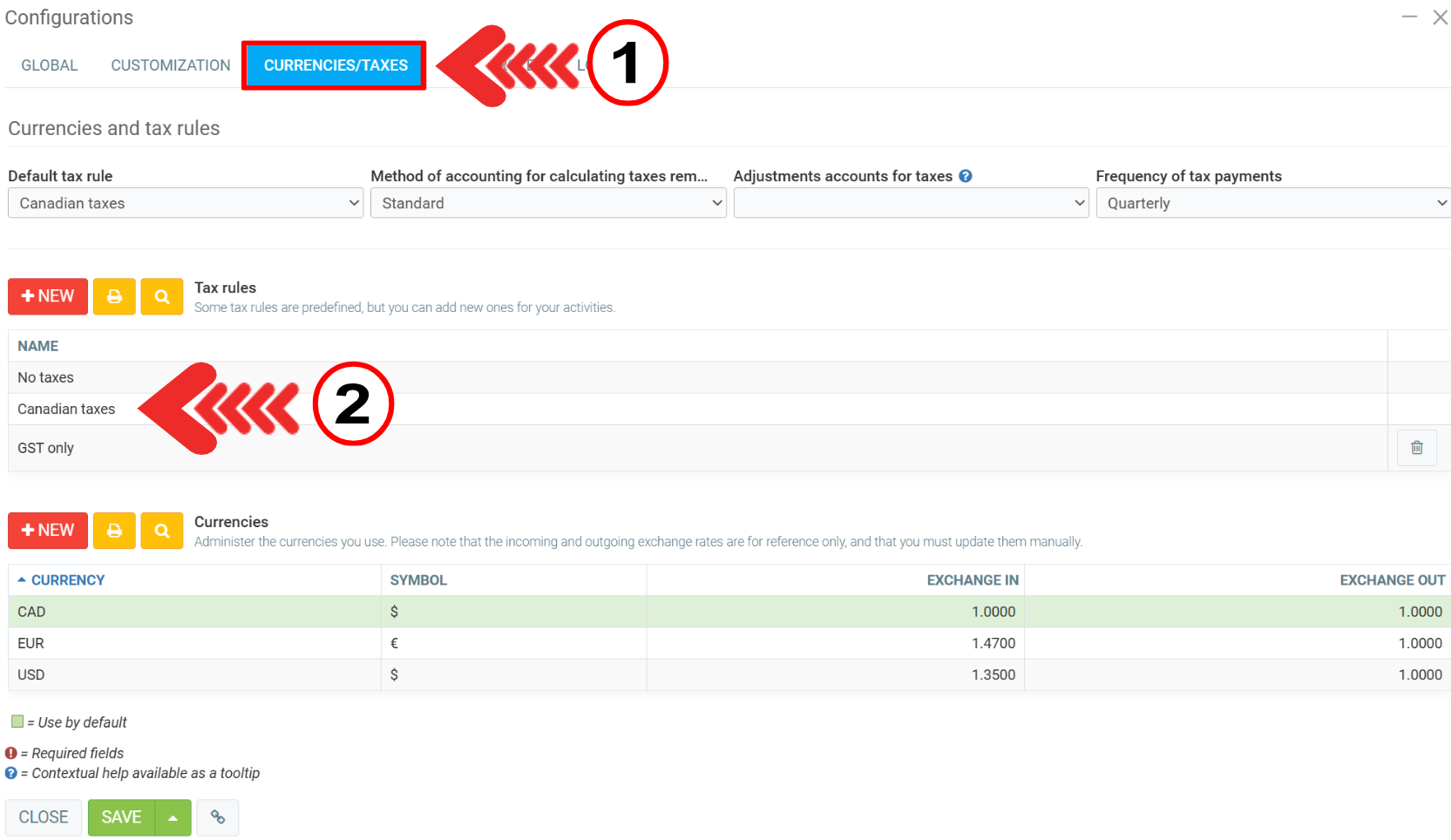 Then click on Currencies/Taxes tab and search for the taxes you want to include or click on +New beside Tax rules.