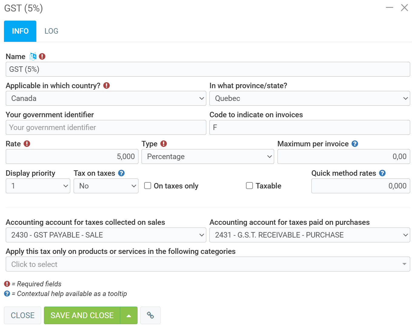 In this section, all taxes are specified by province. You can click on each province to insert your tax numbers. It is important to insert your numbers in each province because if you invoice a customer in a province where the tax number is not listed, it will not appear on the invoice.