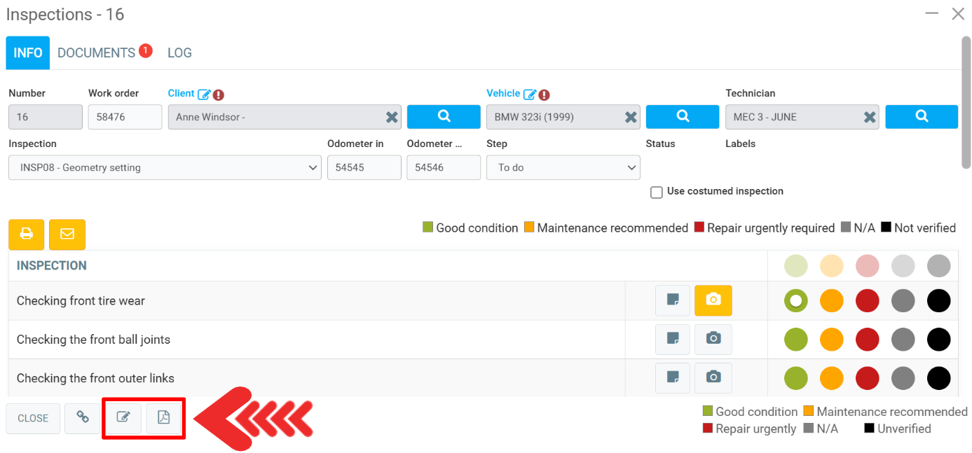 - Create the PDF document, by clicking on the icon at the bottom of the inspection.