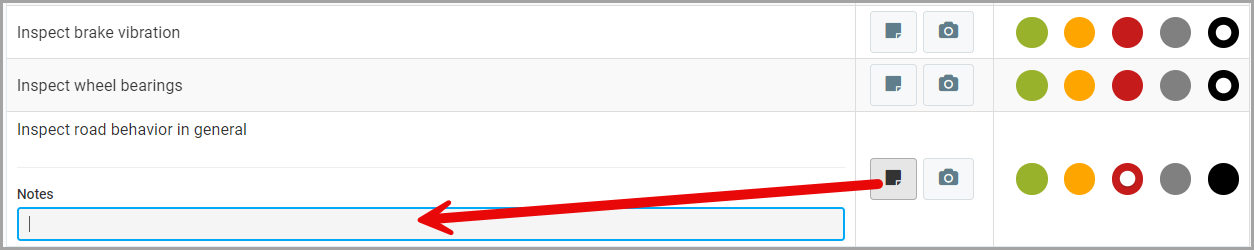For each item, you can also add a note and/ or a photo by clicking on the appropriate button locate on the left of the coloured dots.