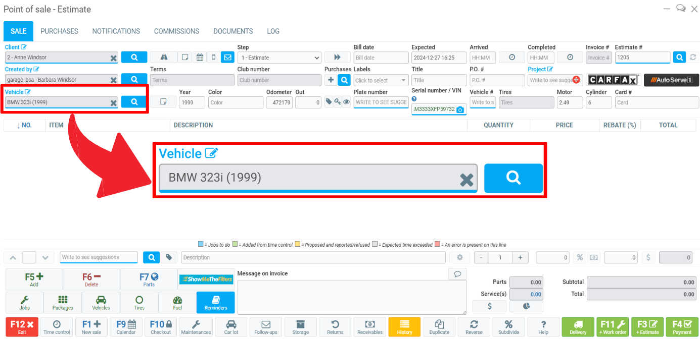 Tip: From the Point of Sale, click on Vehicles in blue just above the text box in order to open the vehicle file without exiting the sale.