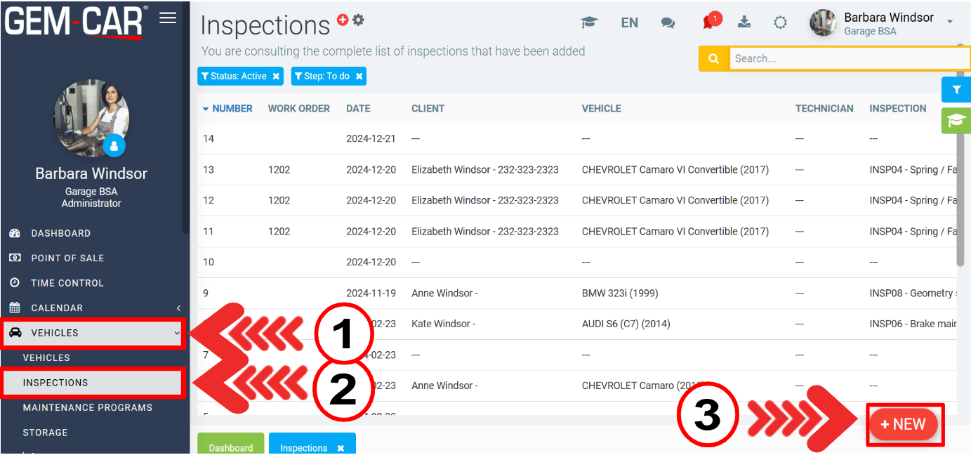Click on Vehicles > Inspections > +New to create a new inspection.