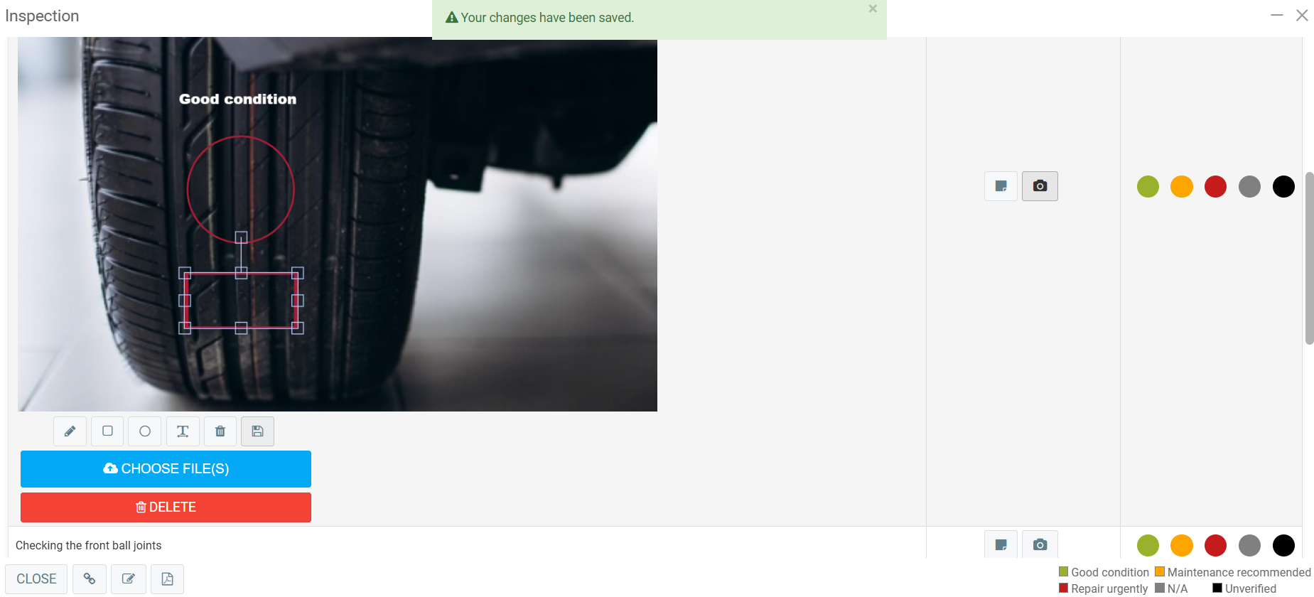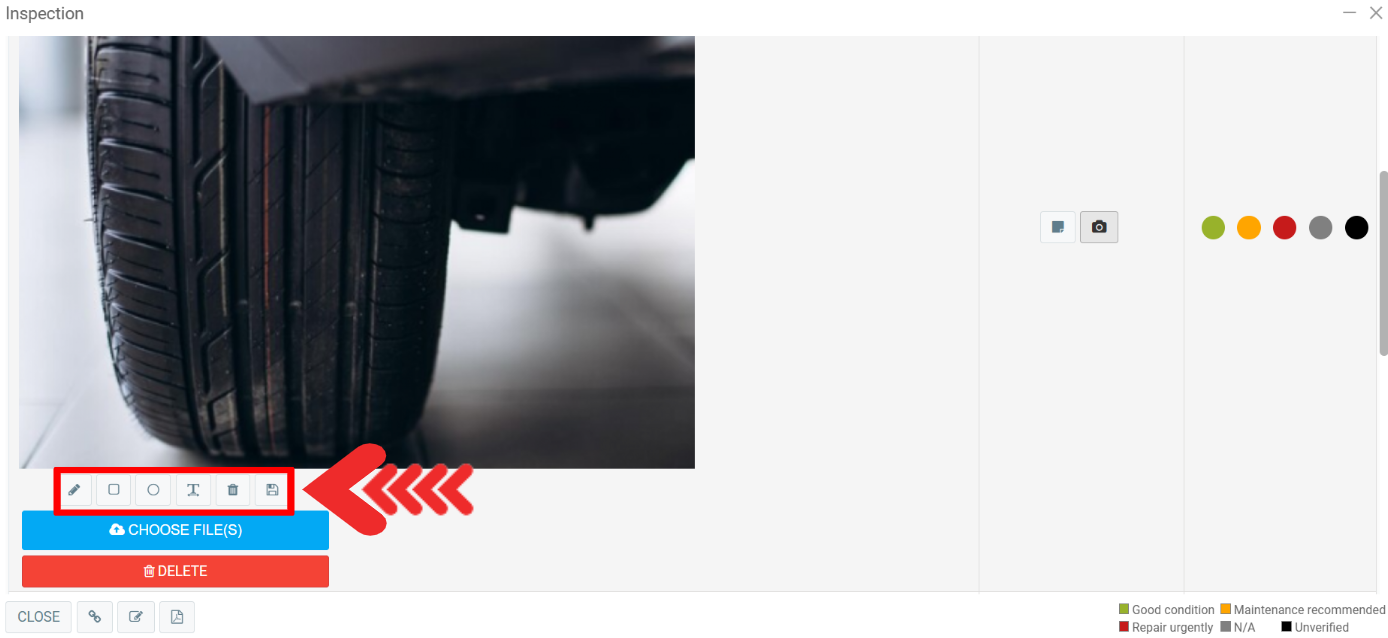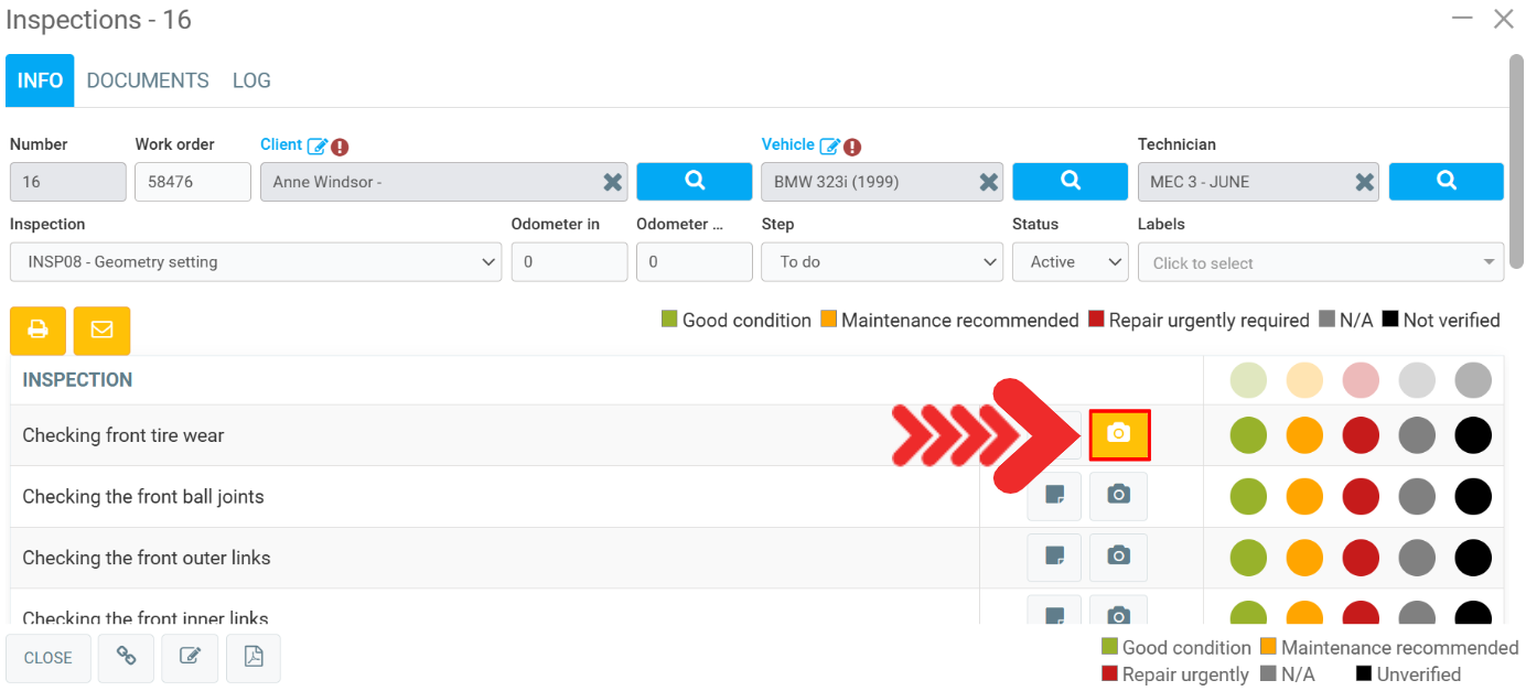 To find out which points of the inspection contain photos, simply observe that the camera changes color, turning yellow when there's a photo file there.