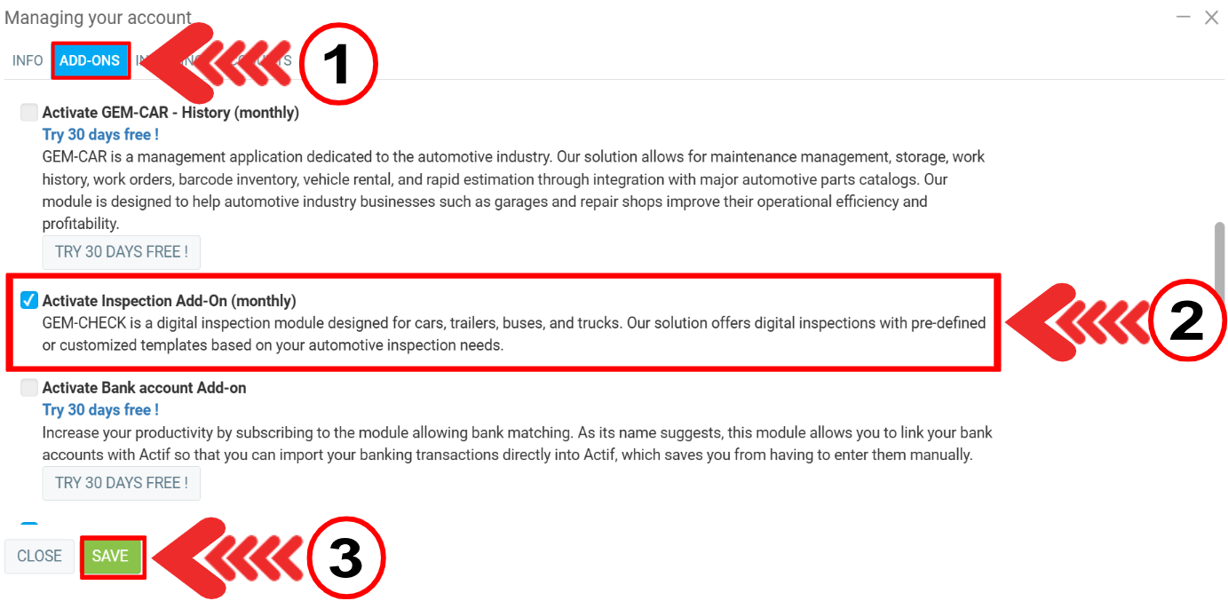 Click on the Add-Ons tab and select Activate Inspection Add-On (monthly).