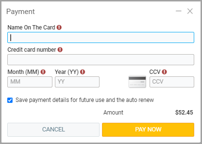 Enter the credit card information for monthly payment of the new subscription and click on Pay Now.