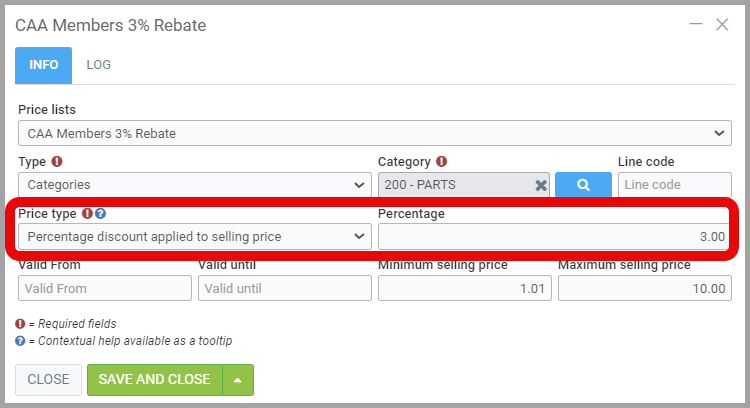 After selecting the Product Type and Category, apply the Price Type Discount Percentage Applied to Selling Price and the desired Percentage. For example, you could choose to apply a 3% discount.