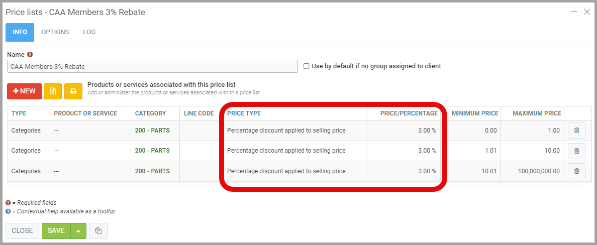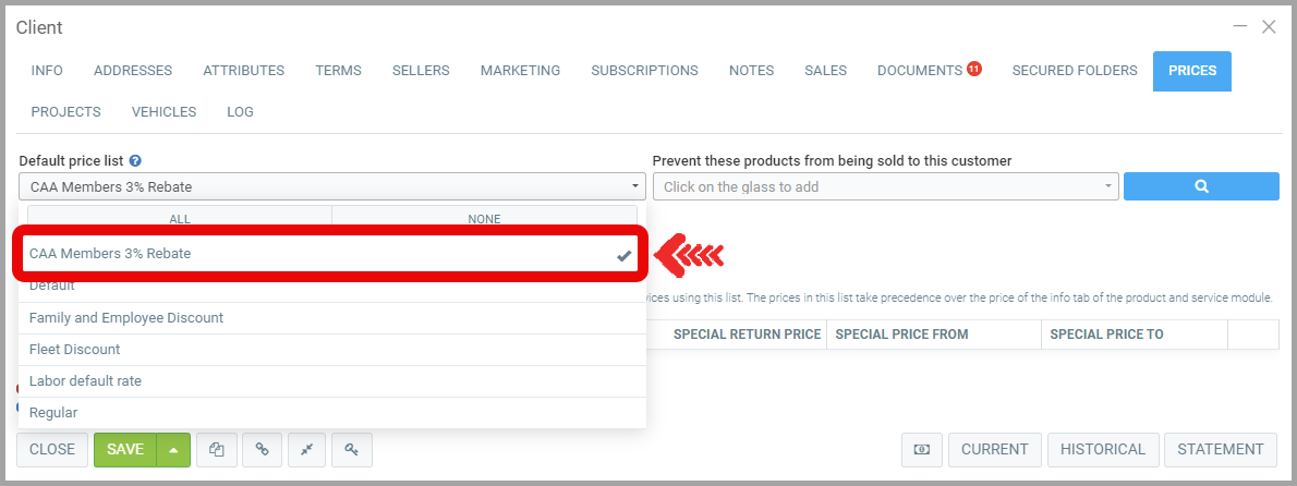 Under the Prices tab, Select the Price List that you have configured for the discount: CAA Member Discount 3%, for example.