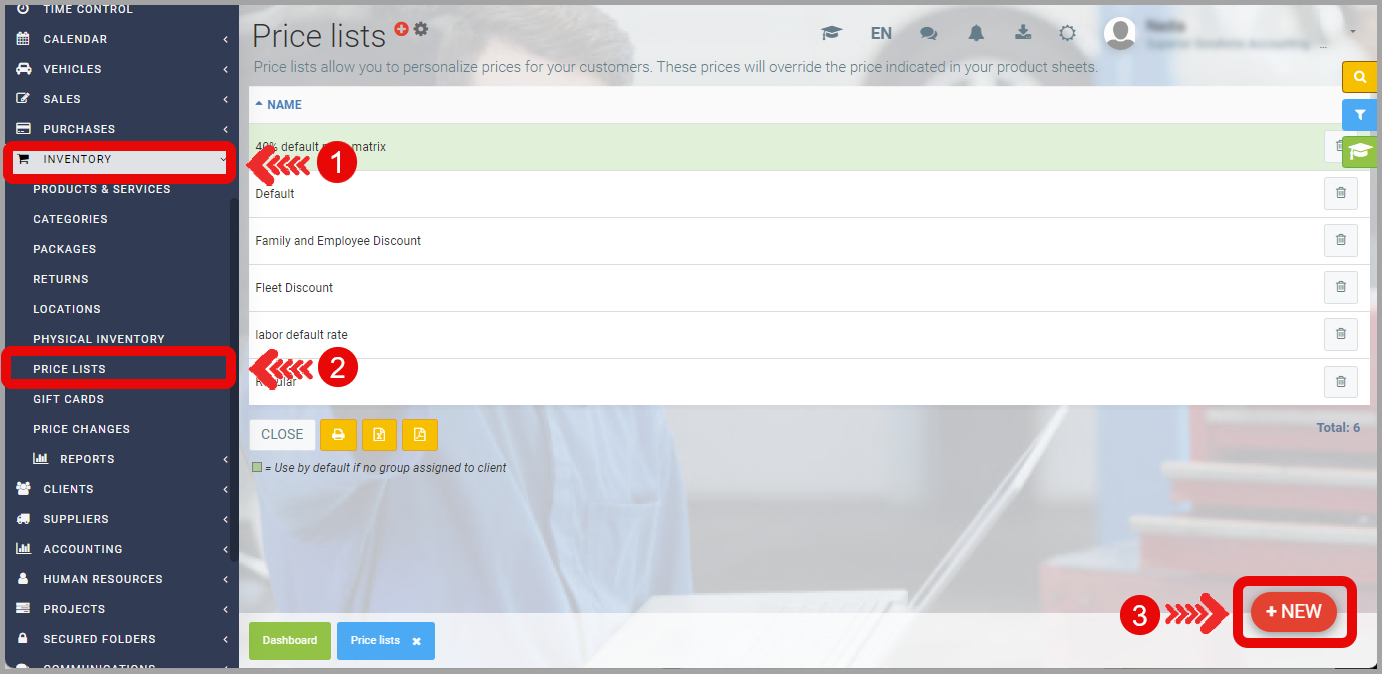 From the main menu on the left of the application, click Inventory > Price Lists > +New.