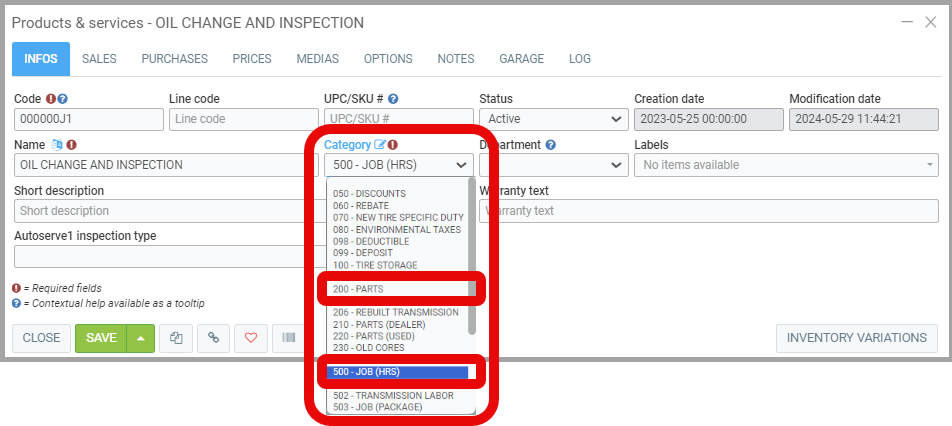 Choose the appropriate Category according to your needs. See Understanding the Categories Defined under Inventory and Products & Services Category Management/ Creating Categories for more details. The two most commonly used categories are 200-PARTS and 500-APPOINTMENT+JOB+HOUR which are predefined in your GEM-CAR.